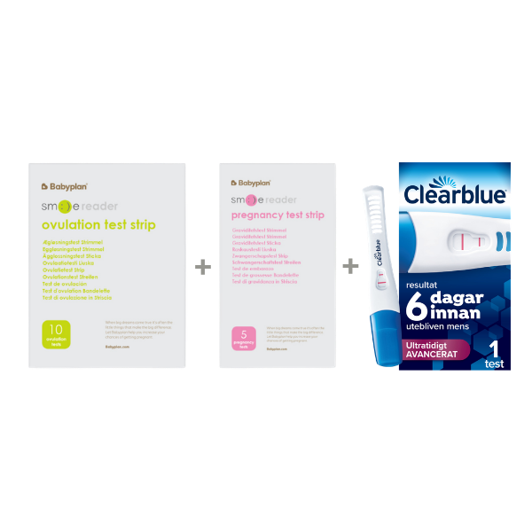 Gör det enklare att pricka rätt dagar – och ta reda på om du är gravid tidigt. Med detta kompletta testkit får du både Clearblue Ultratidigt Avancerat graviditetstest och SmileReader-tester, samlade i ett smart paket.