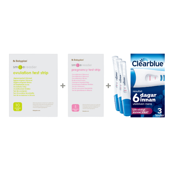 Maximera din trygghet – komplett kit för planering och tidig bekräftelse Vill du ha full kontroll på din cykel och extra trygghet när det är dags att testa? Detta paket kombinerar SmileReaders smarta system för att hitta ägglossning med hela tre stycken av Clearblues mest avancerade graviditetstester. Perfekt för dig som vill kunna testa flera gånger med högsta precision.