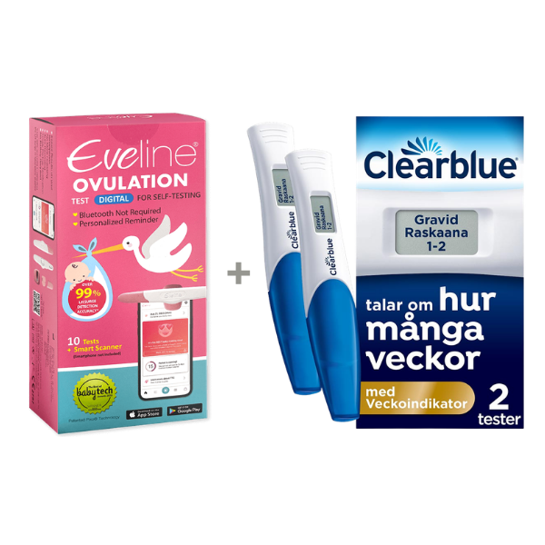 För dig som ställer höga krav på tydlighet och vill ha möjligheten att testa graviditet två gånger med det mest informativa testet på marknaden. Det här paketet kombinerar Evelines digitala ägglossningsspårning med ett 2-pack av Clearblues mest avancerade graviditetstest.