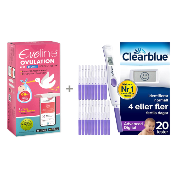 - Totalt 30 ägglossningstester — 10 Eveline + 20 Clearblue Advanced Digital Ägglossningstest