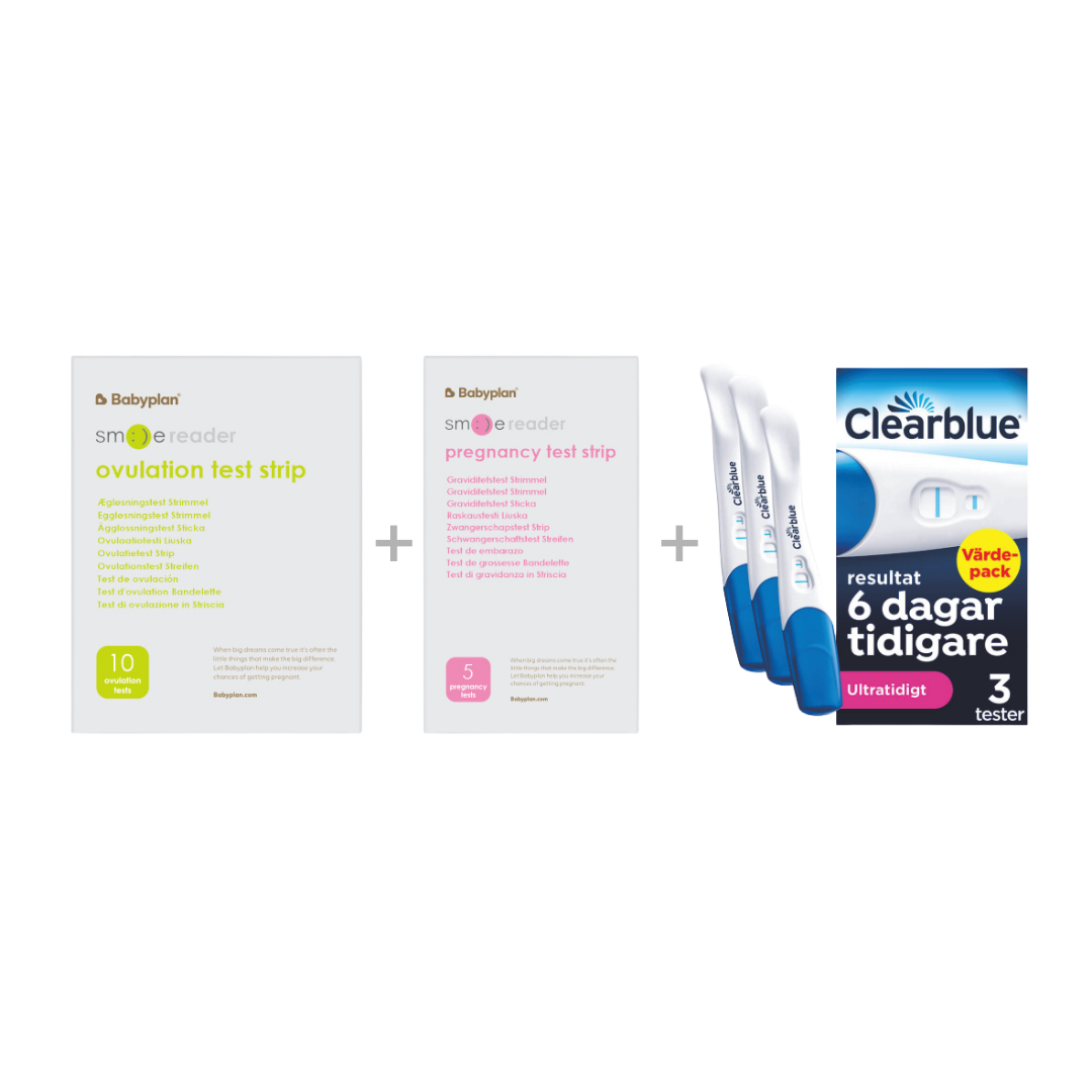 Du får både ägglossningstest och två olika typer av graviditetstest, vilket gör det möjligt att testa tidigt och samtidigt följa din cykel med maximal trygghet.